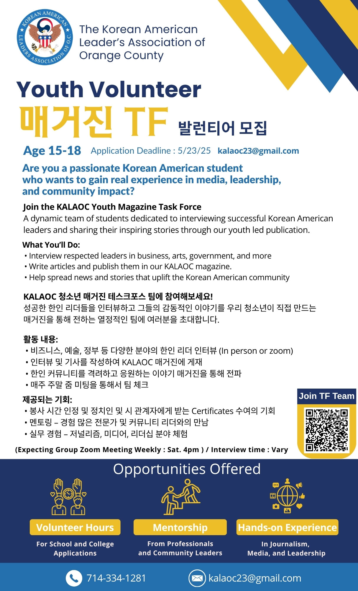 KALAOC 한미지도자 협의회 오렌지카운티 청소년 매거진 TF, 발런티어 모집